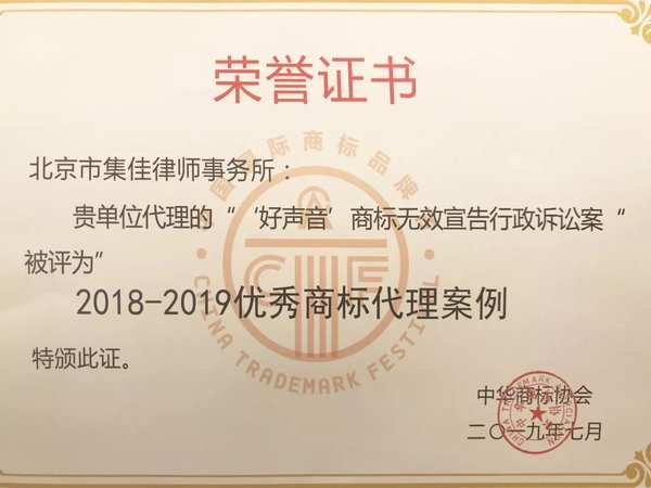 >海星体育>关于我们>荣誉概览>2019>集佳代理“好声音”商标无效宣告行政案入选“优秀商标代理案例”